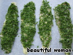 И запанируйте с одной стороны рыбное филе в измельченной зелени. Тушки рыбы кладём на противень, покрытый пергаментом. Выпекаем при температуре 190 градусов 12-15 мин.
