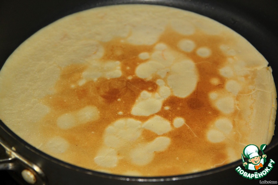 Уложить последний блинчик, накрыть пищевой пленкой и отправить в морозильную камеру на 2-3 часа.
