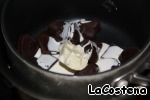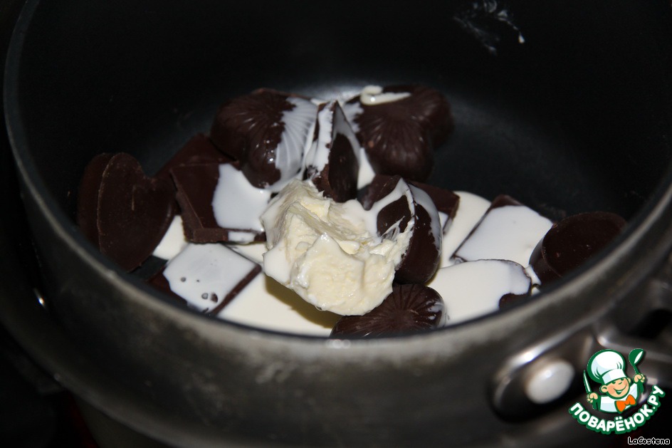 Приготовим шоколадный ганаш: шоколад, сливочное масло и 50 гр сливок поставить на водяную баню. Готовить до растворения шоколада.