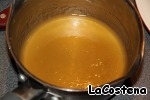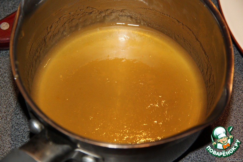 В сотейнике соединить пакетик желе для торта и апельсиновый сок. Все прогреть.