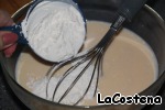 Приготовим блинное тесто: взобьем 3 яйца, добавим молоко и муку.