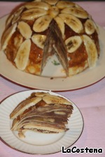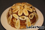 Банан нарезать дольками и украсить пирог. Сверху покрыть апельсиновым желе и отправить на ночь в холодильник.