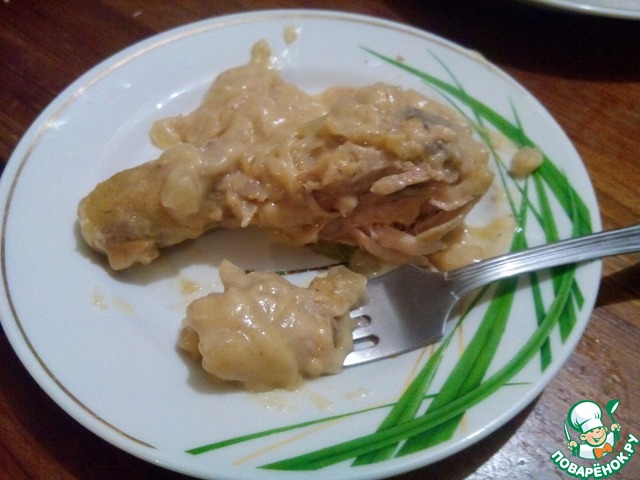 Потом добавляем сметану, заливаем бульоном (немного бульона оставим для разведения муки) и тушим на медленном огне несколько минут. Соус перчим всеми перцами, солим по вкусу.