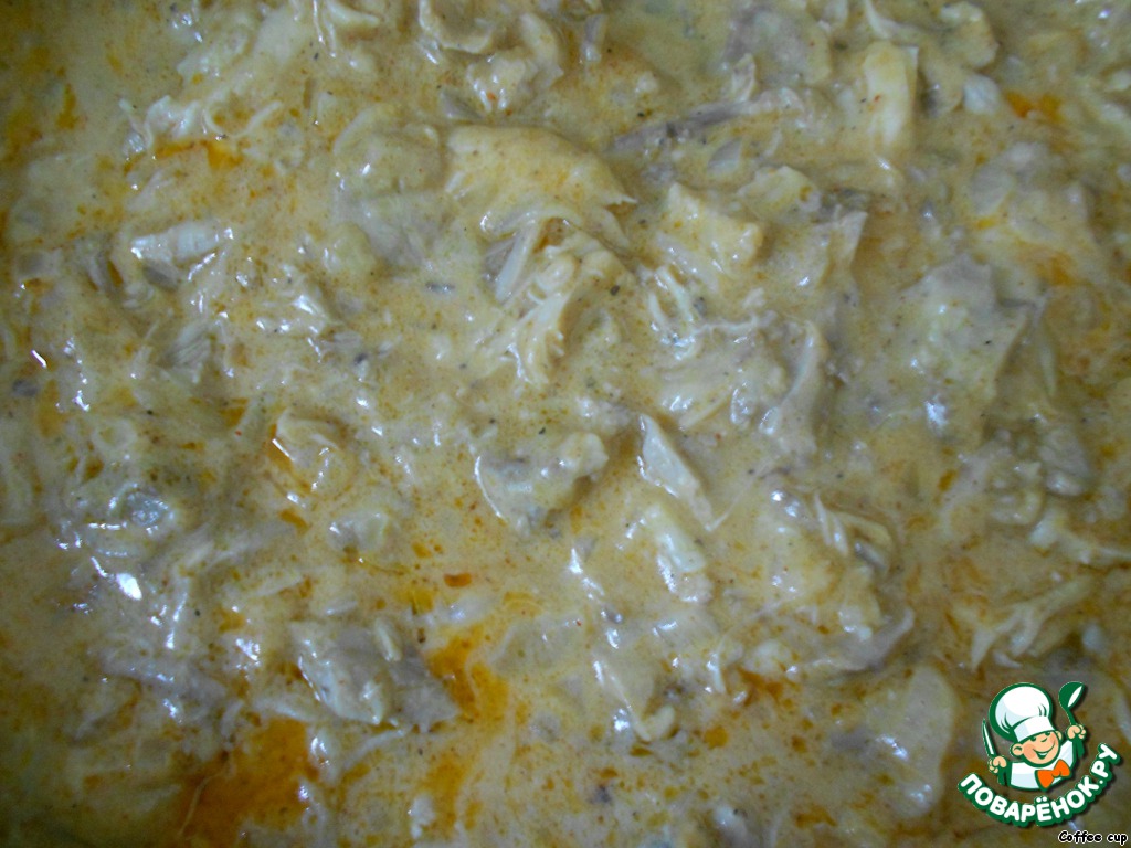 В самом конце добавляем в соус разведенную оставшимся бульоном муку для загустения. Степень густоты соуса можно варьировать, добавляя больше или меньше муки. Выдавливаем или мелко нарезаем чеснок.
