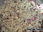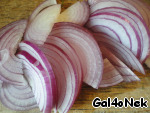Лук режем тонкими полукольцами, сбрызгиваем яблочным (или другим уксусом). При тепловой обработке такой такой лук остается слегка хрустящим и с легкой кислинкой.