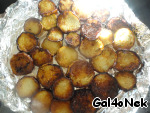 Из двойной фольги формируем круглую форму диаметром примерно 30 см. На дно выкладываем баклажаны. Я уже писала в ингридиентах, что желательно поджарить 2 баклажана, но я приготовила с 1-м. Мне этого показалось маловато. В следуюший раз точно возьму два.