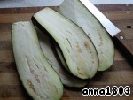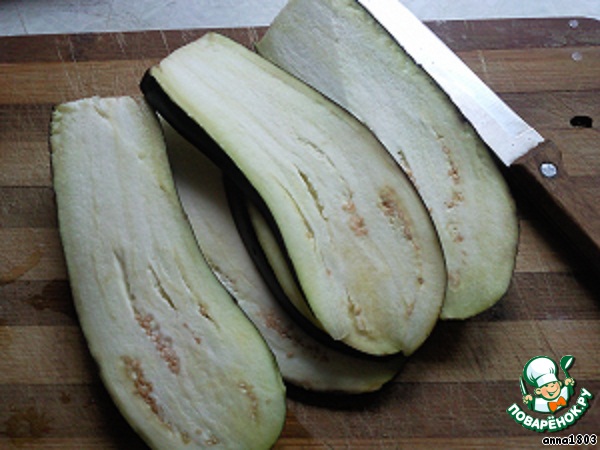 1. Моем баклажаны, режем на продольные пластинки и оставляем в соленой воде.