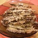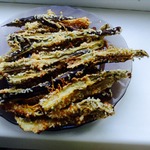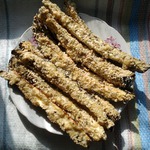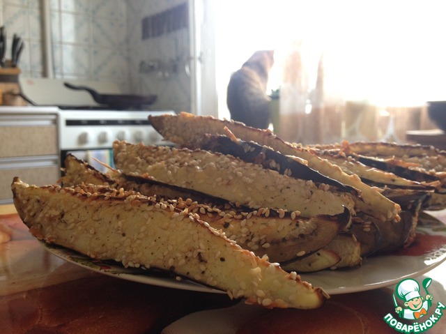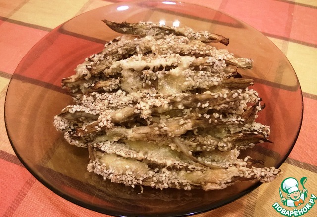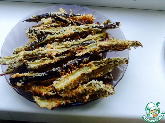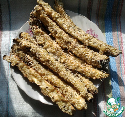 Замаринованные полоски баклажанчиков опускаем в яйцо, затем в сыр с кунжутом.