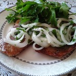 Как вариант приготовить свиной стейк с маринованным луком. Обжарить свиные стейки до румяной корочки точно так же, как в первом рецепте. Простите, только сейчас увидела, что у меня нет отдельно отснятого стейка в готовом виде. Нарежем салатный белый лук кольцами и измельчим зелень петрушки.
