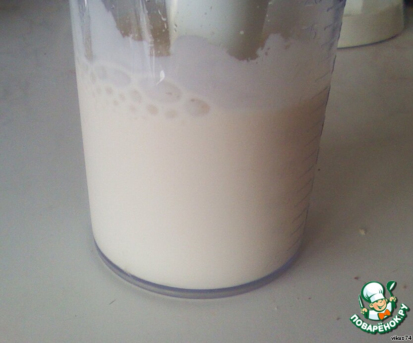 Теперь блендером смешайте основу и добавку до стостояния, напоминающего молочный коктейль (густая жидкость с пузырьками)