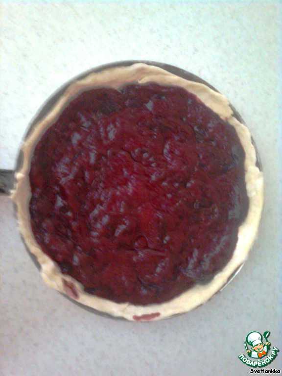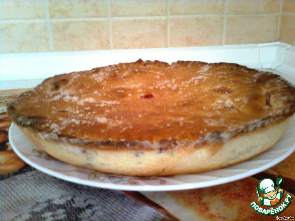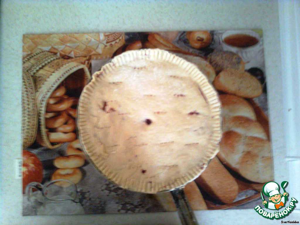 В смазанную маслом форму выложить тонко расскатанный пласт теста, выложить начинку, посыпать сахаром, накрыть пластом теста. Сверху обязательно сделать отверстие, наколоть вилкой и выпекать.