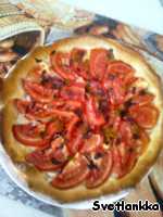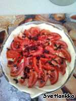 В этот раз я готовила открытый пирог с помидорами и базиликом. В смазанную маслом форму выложить тонко расскатанный пласт теста, смазать подсолнечным маслом, распределить по поверхности мелко нарезанный лук, нарезанные помидоры, посолить, добавить мелко нарезанный базилик и орегано