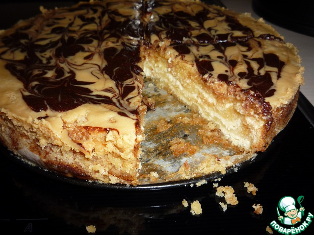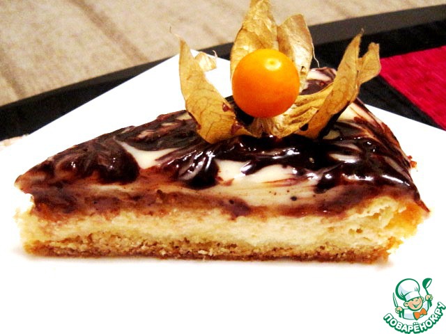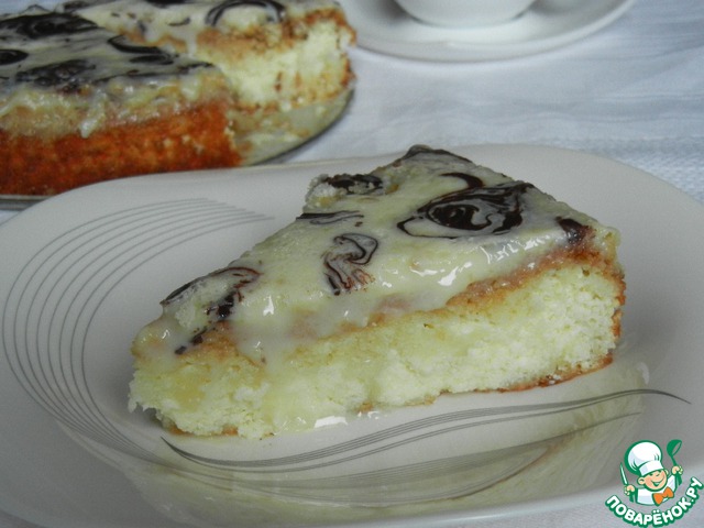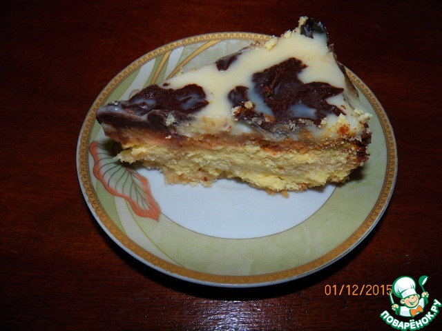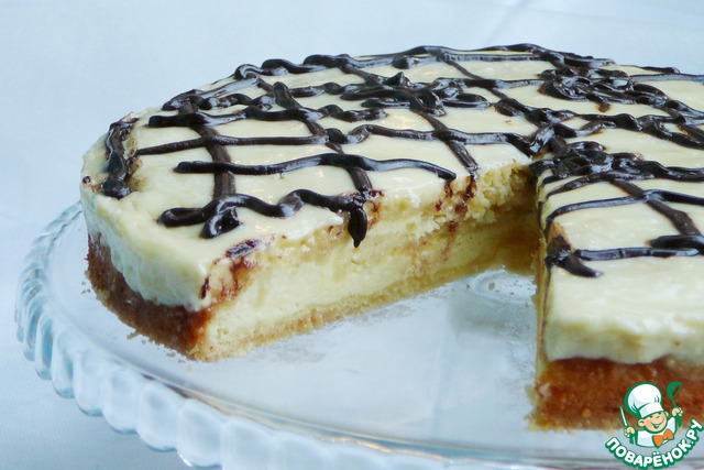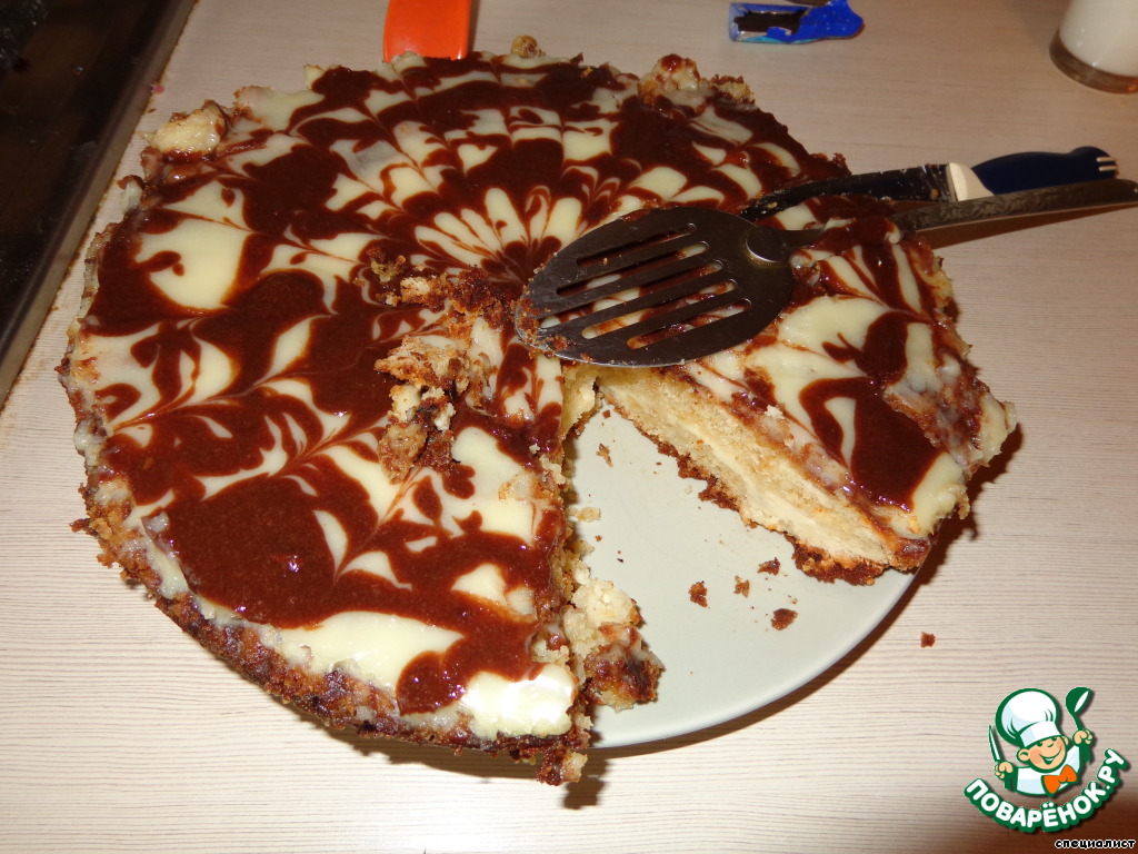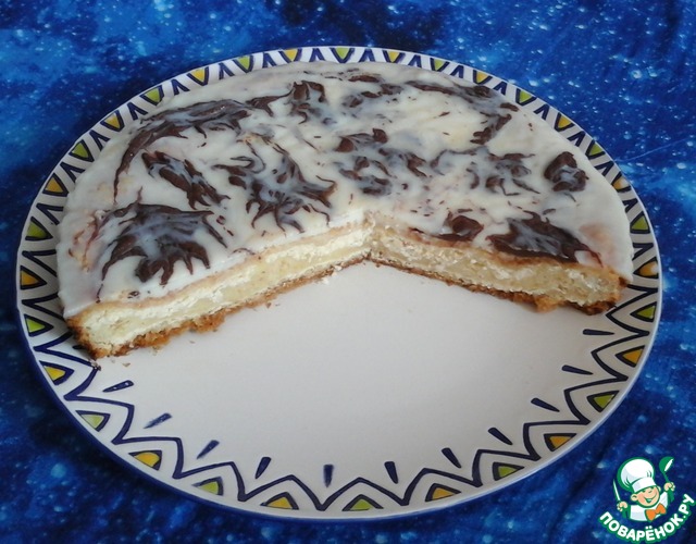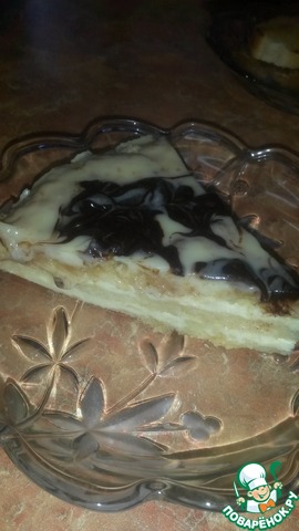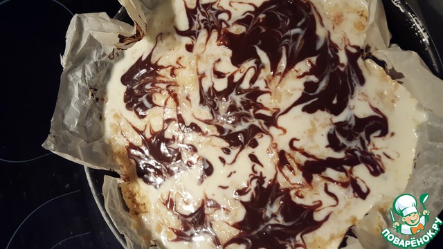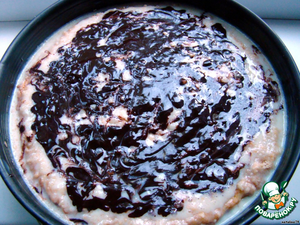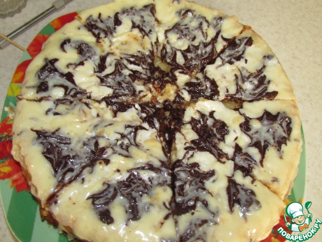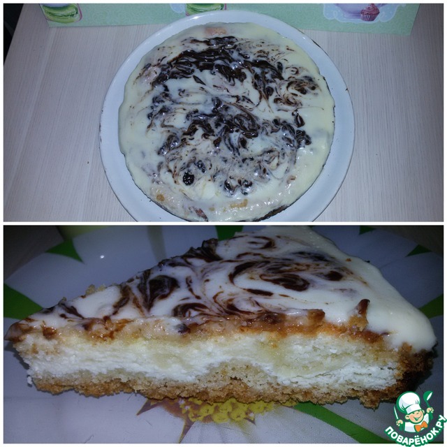 Готовую ватрушку, не вынимая из формы, горячей залить смесью сметаны со сгущенкой, сверху по кругу ложечкой выложить растопленный шоколад и зубочисткой сделать разводы.