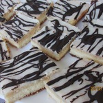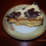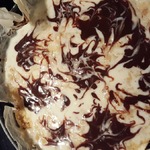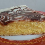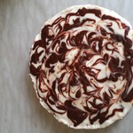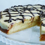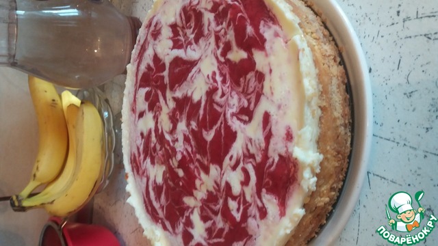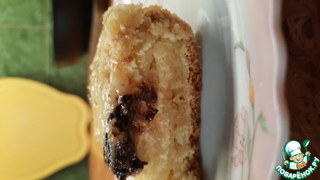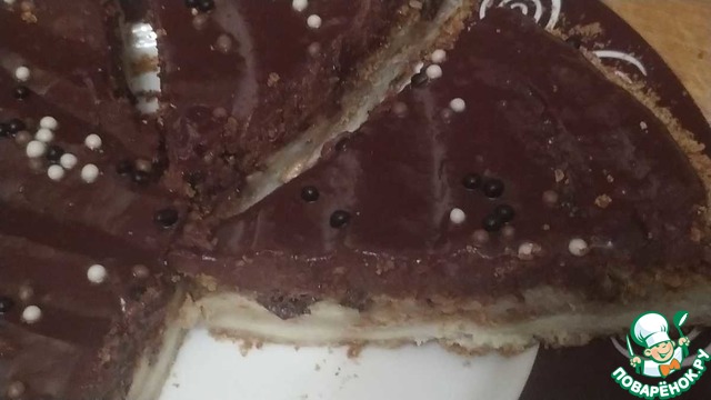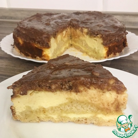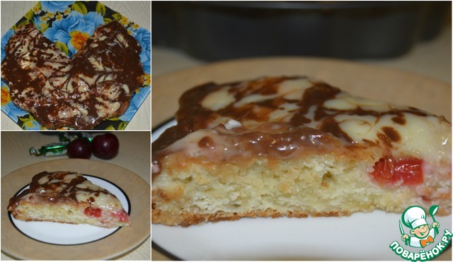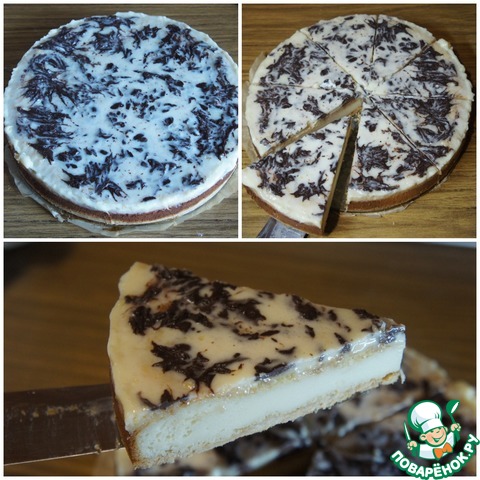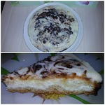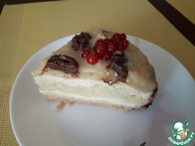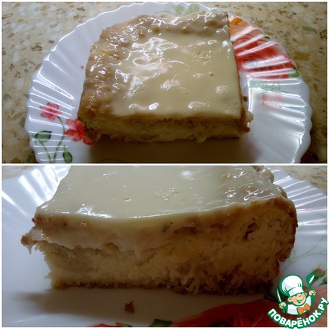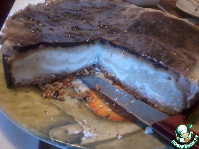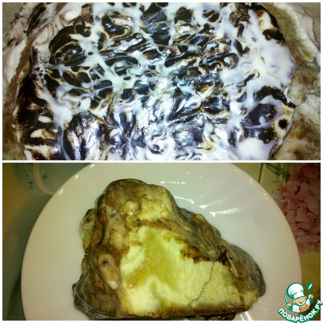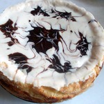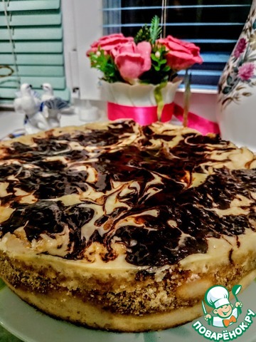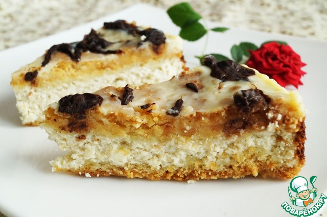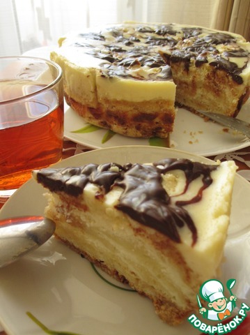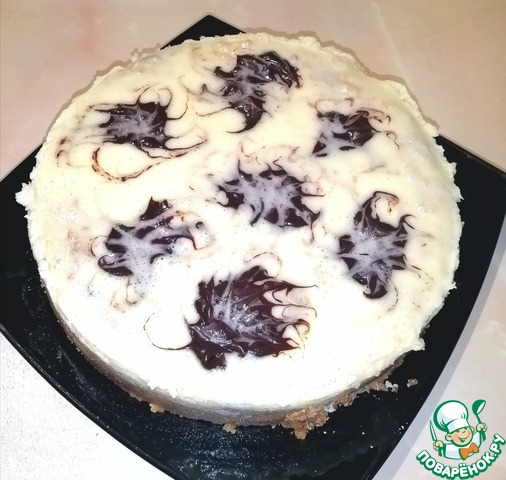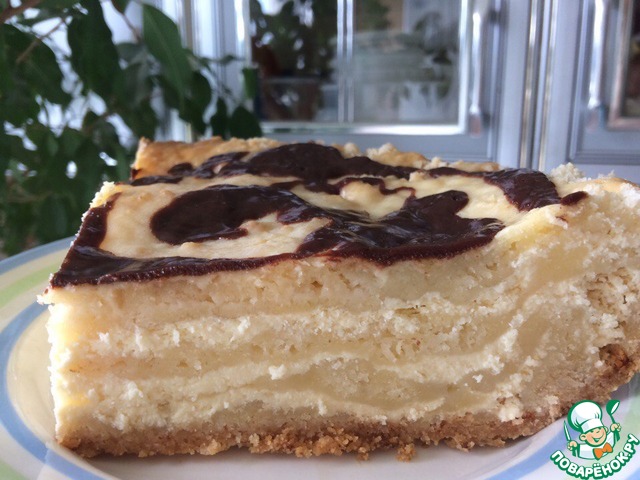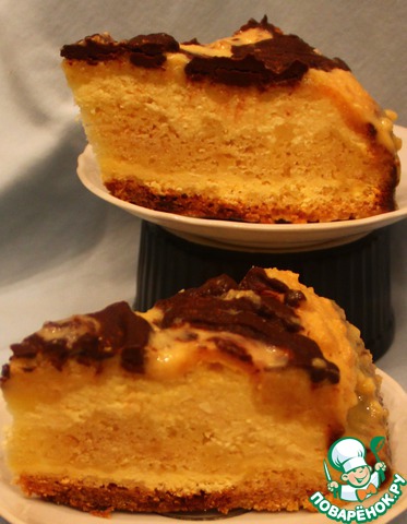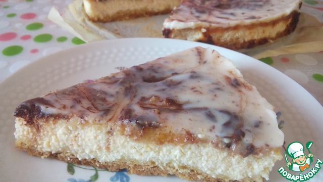 Готовую ватрушку, не вынимая из формы, горячей залить смесью сметаны со сгущенкой, сверху по кругу ложечкой выложить растопленный шоколад и зубочисткой сделать разводы.