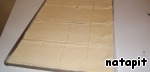 Поместить раскатанное тесто на противень, застеленный пекарской бумагой, и разрезать на 16 частей.