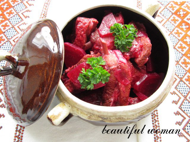 Сложить мясо в кастрюлю, на дно которой выкладываем ломтики нарезанной сырой свеклы.