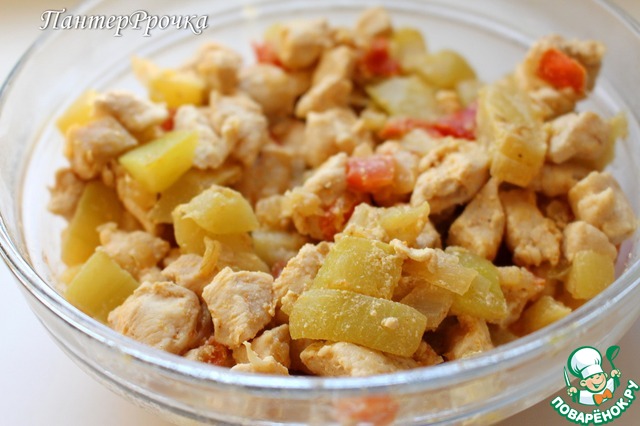 Сначала куриную грудку освобождаем от костей, нарезаем небольшими кубиками, обжариваем в растительном масле на сковороде до румяной корочки. Сковорода должна быть хорошо разогрета, а курицу старайтесь уложить в один слой - чтобы она равномерно обжарилась, а не начала тушиться. Обжариваем быстро 4-5 минут максимум. Обжарили, сложили курицу в отдельную кастрюлю.