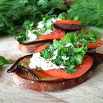 После того как баклажаны прожарились, кладем их на хлеб и смазываем чесноком.