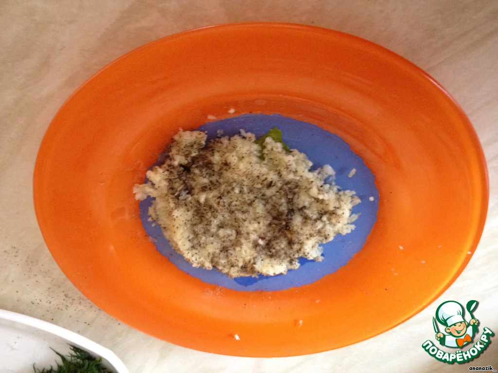 Пока баклажаны пропитываются, давим чеснок, так же по желанию можно добавить черный молотый перец.
