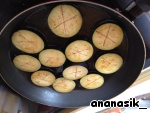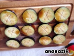 Этот шаг по желанию,но на мой взгляд получается намного вкуснее! Нарезаем баклажаны колечками толщиной примерно 1-1,5 см., делаем разрез и поливаем небольшим количеством сои (если есть непереносимость к сое, можно подержать в подсоленой воде).