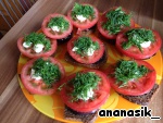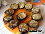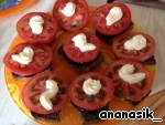 Сверху нарезаем помидор (аналогично баклажанам) и покрываем небольшим количеством майонеза.