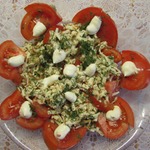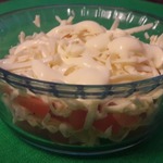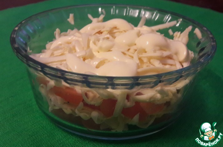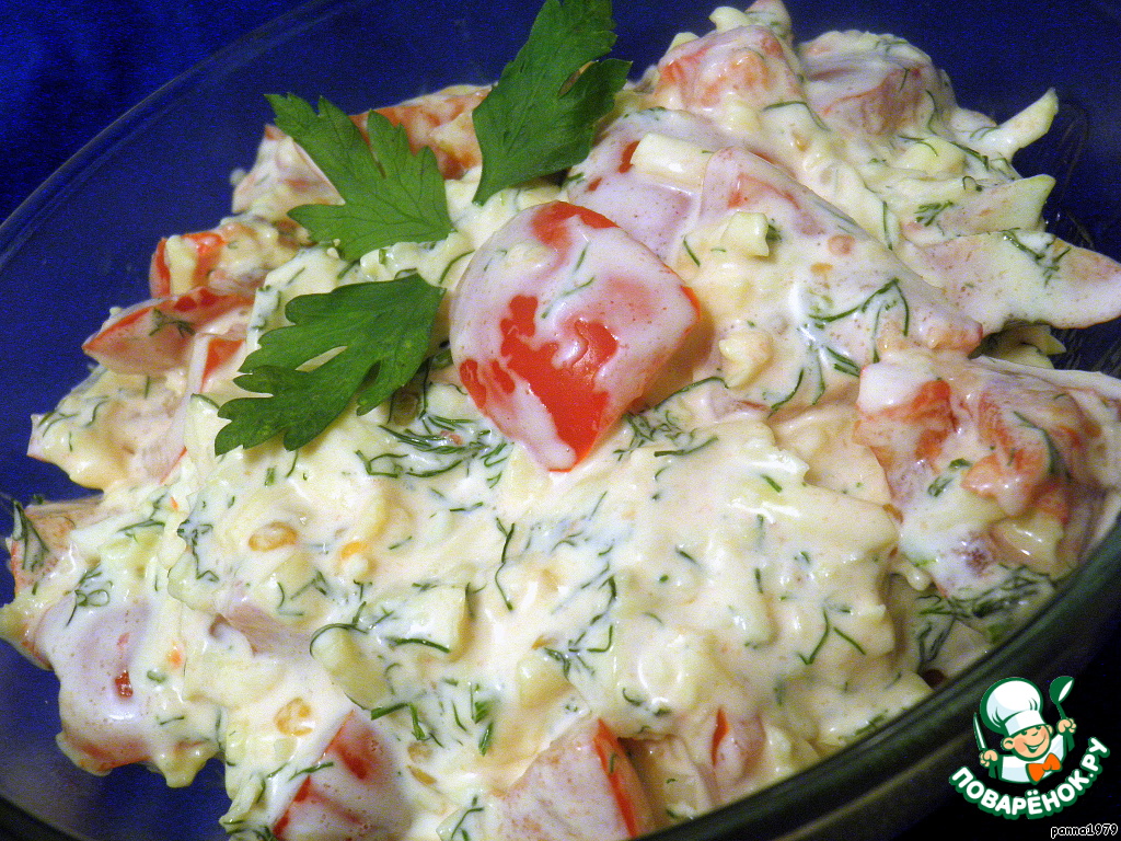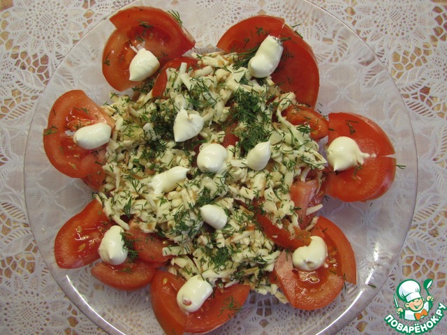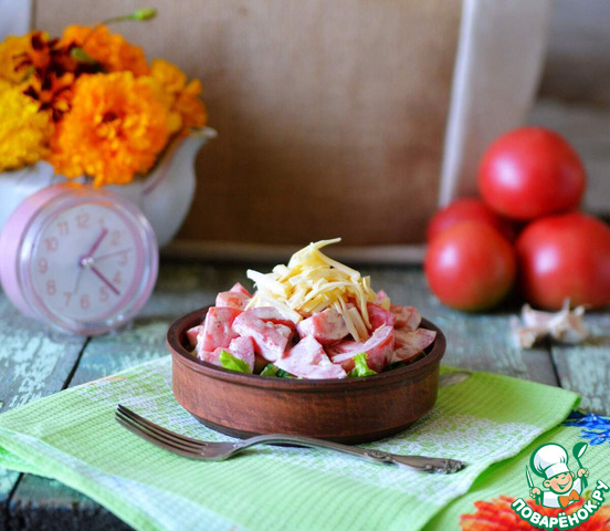 Режем помидоры дольками, натираем колбасный сыр на крупной терке, пропускаем чеснок через пресс. Все смешиваем вместе с майонезом, добавляем зелень, какую любите, у меня укроп.