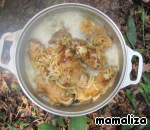Грушинский фестиваль... Легендарный фестиваль любителей бардовской песни и не только. Здесь собираются родственные по духу люди с разных уголков нашей планеты. Те, кому дороги посиделки у костра, душевные встречи друзей, песни под гитару. Еда у туристов довольно однообразная. Молодежь, в основном, питается едой из пакетиков. Обладатели более-менее пухлых кошельков питаются в многочисленных уличных кафешках. Мы же, люди солидные, устроили праздник живота. Каждая семья приехала с набором продуктов и со своим фирменным блюдом. Продуктов брали столько, что каждая семья могла прокормить всех обитателей нашего лагеря. Хочу оговориться, что это не есть традиция. Обычно я готовлю супчики, чай из ягодных веток. Вечером шашлыки. Вкусно, сытно, легко. Одним блюдом из нашего грушинского меню я хочу поделиться. Его рецепт привезли друзья из Белоруссии.