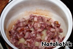 Пока жарится грудинка, мелко рубим лук. И добавляем его к грудинке.