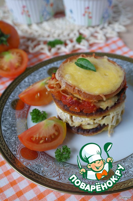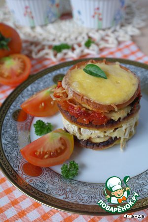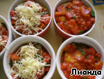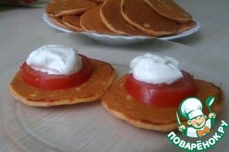 Прикрыть это оладушками. Сверху по чайной ложке с горкой томатной начинки, еще присыпать сыром.