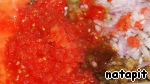 Добавить лук (если нет красного - используйте белую часть зеленого лука), чеснок, помидоры, очищенные от кожицы и натёртые на тёрке, сок лимона, соль и перец.