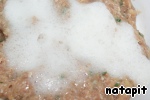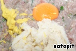 Белки отделить от желтков. В фарш добавить горчицу, специи, хлеб и желтки и очень хорошо перемешать.