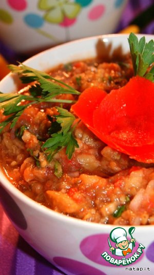 Баклажаны вымыть, вытереть насухо и проткнуть в нескольких местах вилкой. Запечь под грилем или на открытом огне до готовности и поместить в закрывающуюся ёмкость. Остудить и очистить.