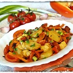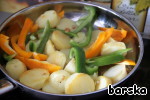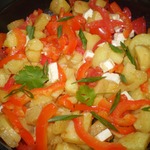 Добавить подготовленный картофель и сладкий перец, нарезанный тонкими полосками. Дать овощам подрумяниться со всех сторон.