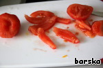 Помидоры надрезать крестообразно, ошпарить кипятком (или бланшировать в кипятке несколько минут), потом - обдать холодной водой, снять кожицу. Разрезать на четвертинки и удалить семенную часть (использовать семенную мякоть и сок для томатного супа или соуса). Твёрдую мякоть нарезать полосками.