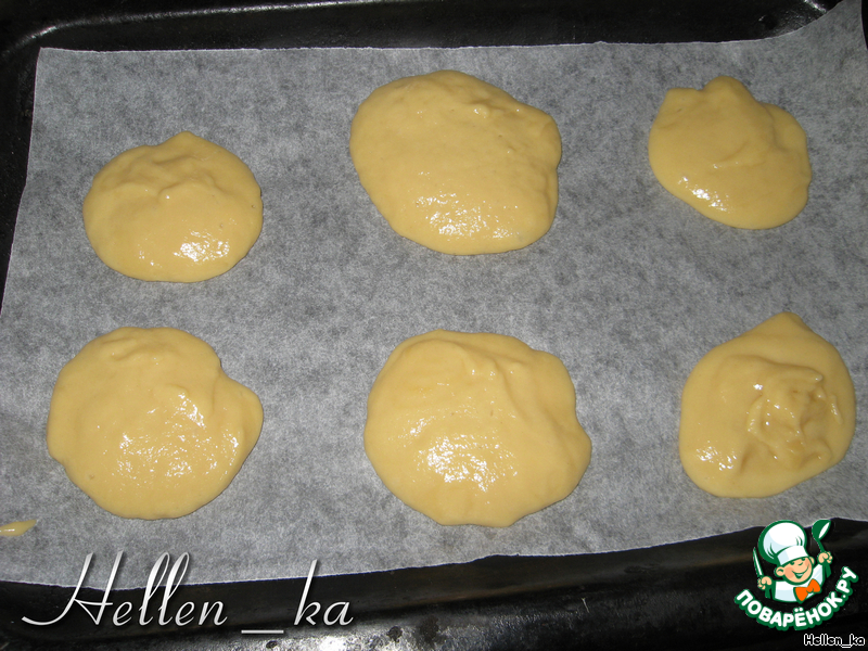 Теперь застилаем бумагой для выпечки противень, смазываем сливочным маслом и чайной ложкой выкладываем тесто. Выкладываем печеньки на расстоянии 3-5 см друг от друга - они расплываются.