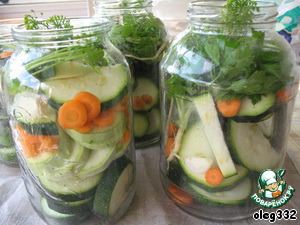 Молоденькие (не более 10см) промытые кабачки нарезаю кружочками толщиной 1см. Морковь так же нарезаю кружочками, но потоньше. Укладываю в стерилизованные 2-х литровые банки. Далее кладу зубчики чеснока, зонтики укропа, петрушку.