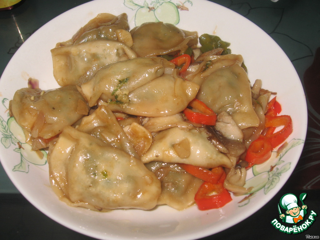 Случилось так, что не было воды в доме, а есть охота! Картошка, макароны и салат отпали сами собой, т. к. не было в чем мыть и в чем варить. В холодильнике была пачка пельмешек и пачка шампиньонов замороженных. Сначала была идея просто пожарить пельмени... но показалось, что на троих их будет мало. И возникла идея жарить их с грибами.