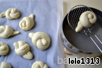 Вытащить брецель большой шумовкой ( только не алюминиевой ) и разложить на противень, застеленный бумагой для выпечки (лучше всего брать не бумажную , а многоразовую которую можно мыть или силиконовый коврик, а то брецели к бумаге прелипнуть могут), или же смазать противень маргарином. Сверху брецель слегка разрезать и теперь можно посыпать крупной солью, или сезамом, или маком, или же тёртым сыром.