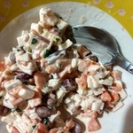 Этот рецептик я утащила из магазина, из отдела готовых салатов. Причем, забавная история получилась. В салате привлекло меня само название «Итальянская трапеза», а из чего сделан не поймешь, на ценнике ингредиенты не написаны, только фасоль одну разглядела, а остальное - какое-то месиво. Но взяла на пробу грамм 200. Пока дошла до дома, весь его и съела (мне вилку одноразовую выдали). Салат очень понравился, но в ингредиентах я толком не разобралась. Так что, не заходя в подъезд, повернула назад в магазин к продавщице за рецептом. А она меня еще и раззадорила, говорит: "Пустой номер! Не получится, мы уже пробовали!" Но я все же рискнула, и все получилось с первого раза. Простые и доступные ингредиенты, легко готовится, себестоимость копеечная и, как мне кажется, очень удачное сочетание продуктов. Я очень довольна этим рецептом, готовила уже три раза, опробовала на подругах, пока нравится всем без исключения. Поэтому решила поделиться рецептом, попробуйте и вы, может пригодится, ведь салатов много не бывает.
