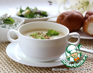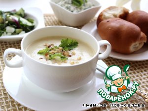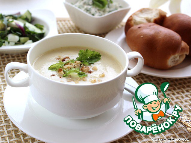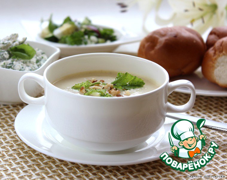 На прилавках наших рынков стала часто появляться кольраби или "капустная репа", которая не только необыкновенно полезна, но ещe и очень вкусна. Из неe легко приготовить закуски, салаты, супы. У кольраби и "вершки", и корешки ценны, так как она буквально наполнена калием, кальцием, магнием, витамином С, клетчаткой. Оптимальный диаметр клубней кольраби - 8 см. Из белого, раннего кольраби получается нежнейший суп, который предлагаю подать с творожной закуской, салатом и пампушками.