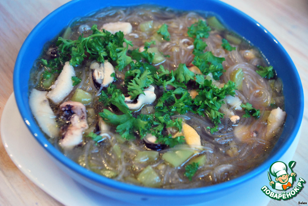 Рецепт «Суп с фунчозой и морским коктейлем»: