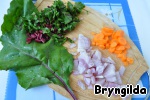 Теперь режем овощи и свекольную ботву и обжариваем слегка в масле, причем листики ботвы не кладем, а кладем стебель.