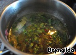 Вливаем бульон и опускаем свекольные листья, солим и добавляем лавровый листик. Даем немного покипеть и выключаем.