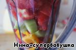 Огурец очистить от кожицы, а перцы - от семян. Все нарезать небольшими кубиками. Отложить по 1/3 кубиков огурца и перцев.