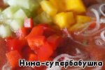При подаче в тарелку с супом положить кучками отложенные кубики огурца и перцев. Добавить укроп и несколько колечков лука.