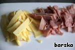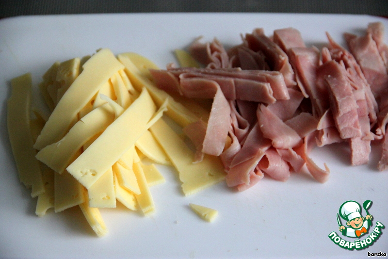 Нарезать полосками ветчину и сыр.