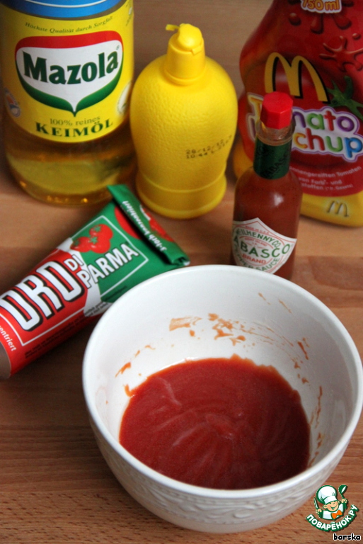 Заправка: смешать венчиком кетчуп, томатную пасту, лимонный сок, растительное масло и табаско.