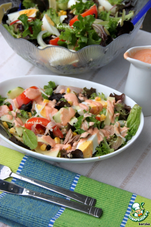 Поливаем заправкой (по вкусу). Заправка - пикантно-острая, но не жгучая, со сливочно-томатной ноткой и "изюминкой" от табаско.