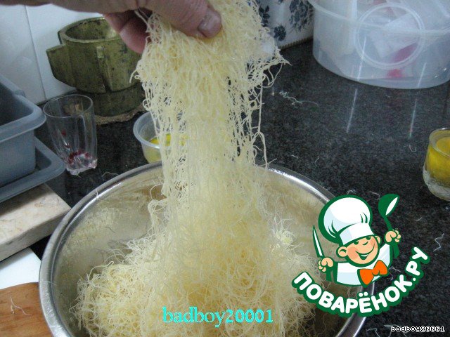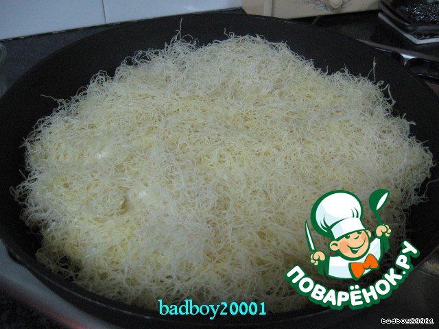 Описание:Популярное на МАГРИБАХ сладость. Хочу познакомить еще с одним видом теста КАДАИФ. В этом варианте пирог ЖАРИЛСЯ!! на сковородке, но можно также и печь.