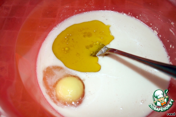 Добавить теплый кисломолочный напиток тан, яйцо, соль, сахар и оливковое масло.